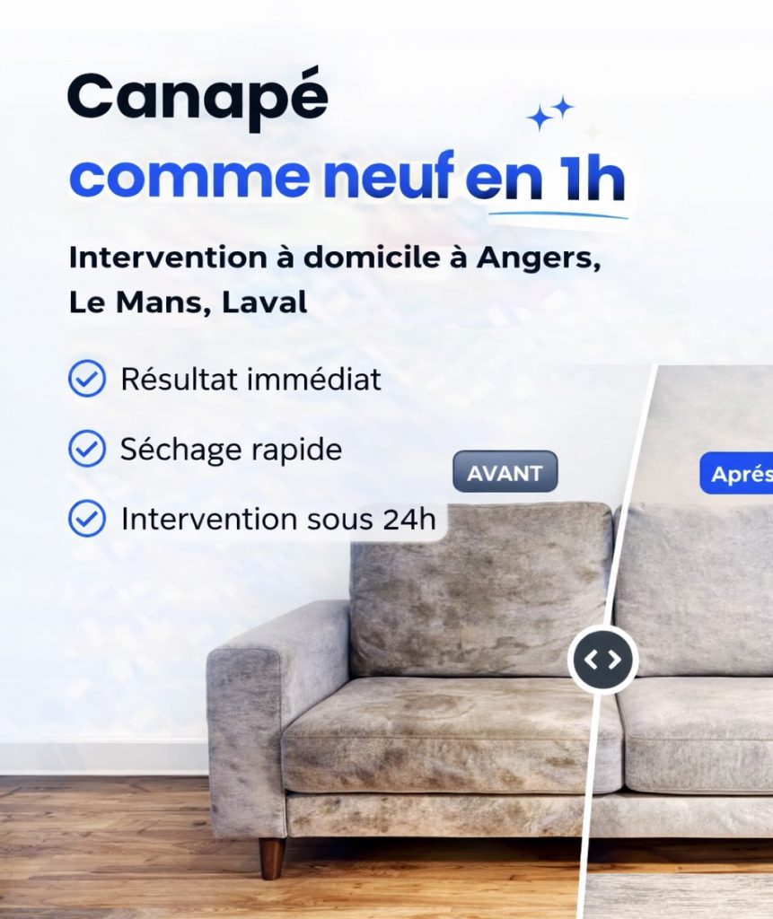 Intervention rapide à domicile à Angers et Le Mans, avec machine de nettoyage de canapé professionnelle pour un résultat visible dès la première intervention.