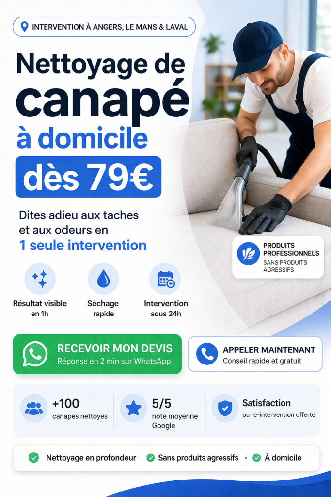 Profitez d’un nettoyage en profondeur sans vous déplacer. Nous intervenons directement à votre domicile à Angers, Le Mans, Laval avec du matériel professionnel pour éliminer efficacement les taches, les odeurs et les bactéries. Chaque intervention est rapide, efficace et adaptée à votre type de canapé, pour un résultat visible dès la première prestation.
